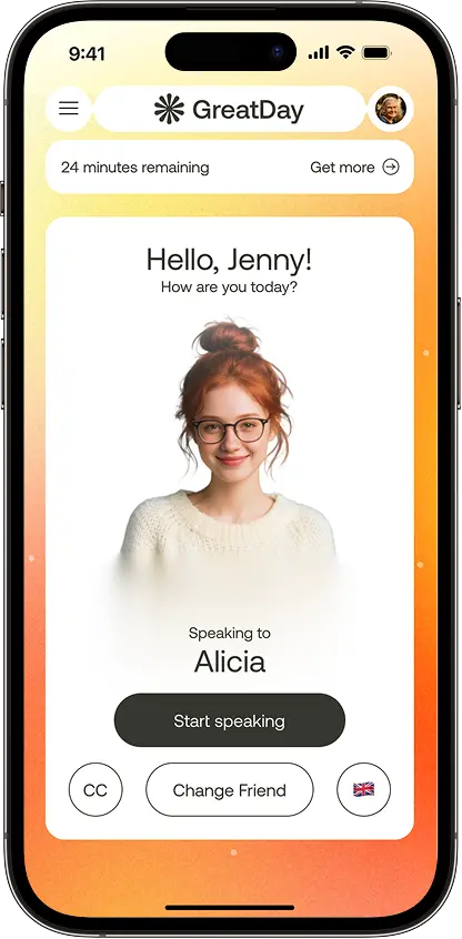 GreatDay is a digital companion. It offers friendly conversations, emotional support, and gentle reminders — helping people stay active, positive, and connected.