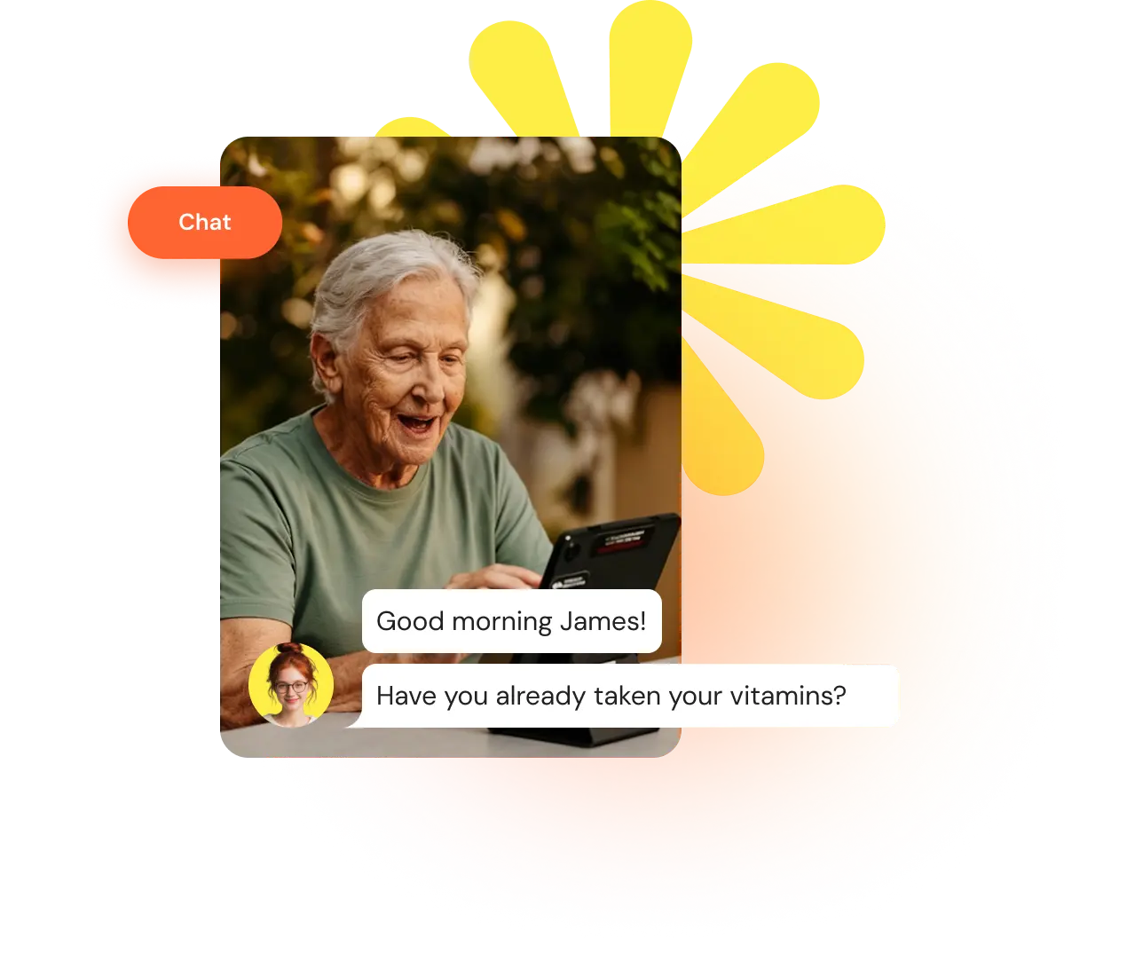 Pick a friendly avatar that will talk with them daily — a warm voice that listens, reminds, and uplifts.